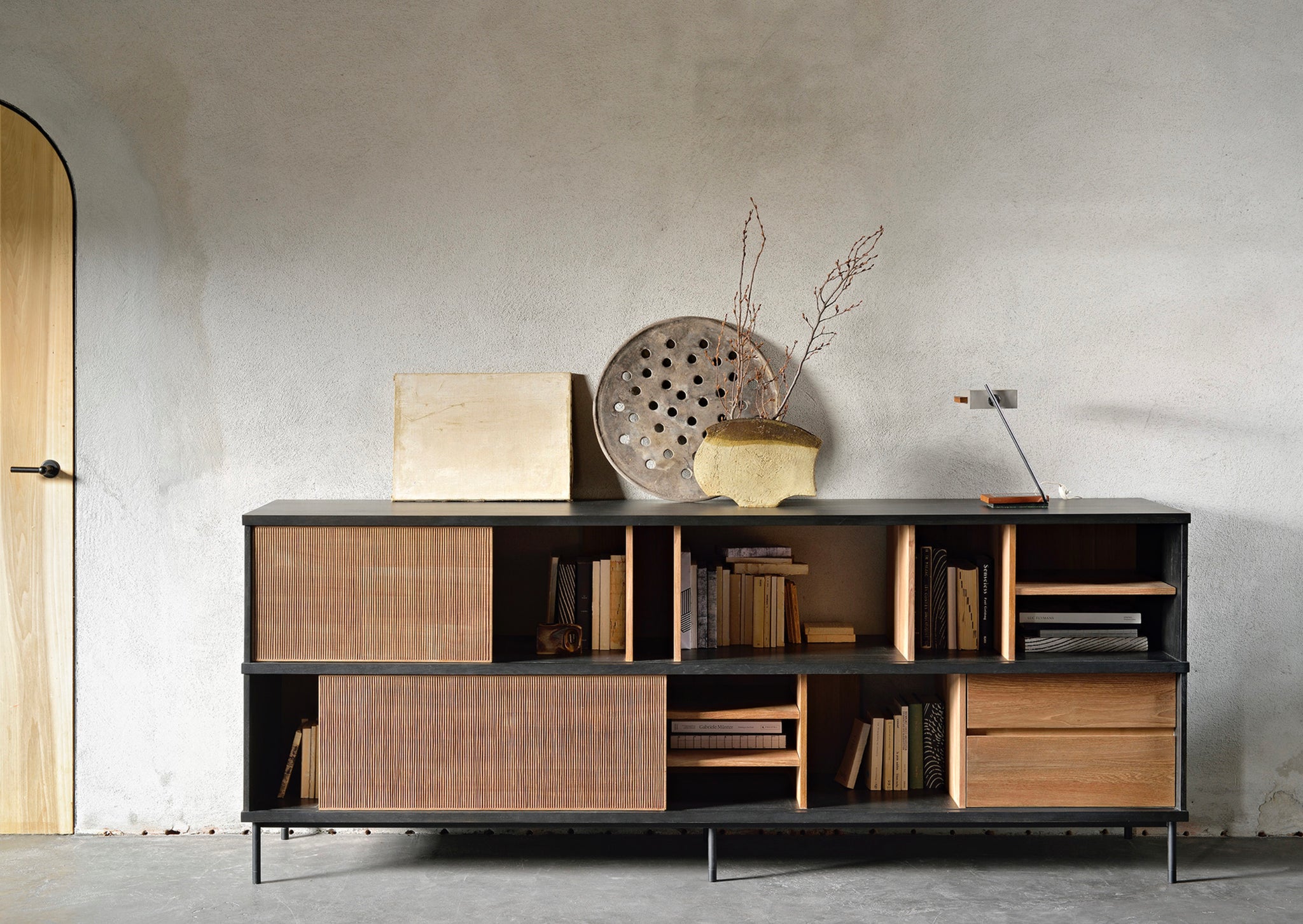 The Oscar sideboard in solid teak by Alain van Havre is the perfect multi-tasker: its open spaces can be used to exhibit personal objects, whereas the sliding doors offer the option of organizing documents out of sight. Notice the exceptional grooves in the doors: each narrow groove was carefully hand carved, making every Oscar piece unique.
